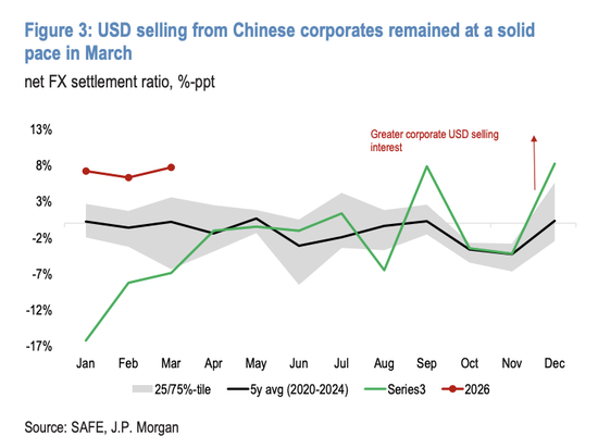 摩根大通认为,企业结汇需求构成人民币中期走强的重要支撑。中国企业的美元抛盘更具持续性,春节季节性因素消退后动能依然强劲。3月总外汇结算比率与净外汇结算比率均创2020年以来同期最高水平。更重要的是,出口商不仅将当期增量美元收入结汇,还在主动消耗过去数年积累的存量美元储蓄。