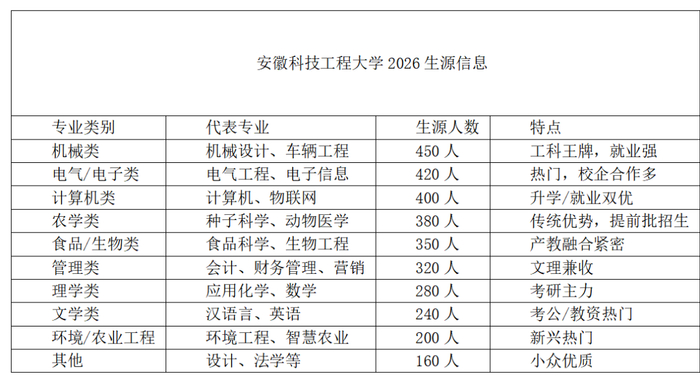 4.高校基本情况:安徽科技工程大学是一所办学历史悠久、文化底蕴深厚、多学科协调发展的省属本科院校。学校起始于1950年的皖北高级农林学校,1965年开始举办本科教育。历经安徽凤阳农业专科学校、安徽农学院凤阳分院、皖北农学院、安徽农业技术师范学院、安徽技术师范学院、安徽科技学院等变迁,2026年更名为安徽科技工程大学,2012年开始独立培养研究生,2021年成为硕士学位授予单位。学校现有二级学院14个,本科专业66个,硕士学位授予点14个。拥有省级重点学科、省级高峰培育学科、省级特色学科等11个,国家级一流本科专业建设点、综合改革试点专业、特色专业、卓越工程师教育培养计划专业、复合应用型卓越农林人才教育培养计划改革试点专业等12个,省级一流本科专业建设点、一流(品牌)专业、综合改革试点专业、特色专业等46个。获国家级教学成果奖二等奖2项,省级教学成果特等奖4项、一等奖14项。获批国家级一流课程4门,承担国家新工科、新农科、新文科研究与实践项目5项。