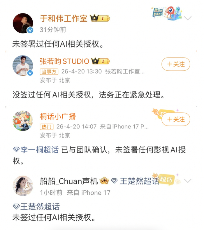 当天#爱奇艺AI艺人库# 词条冲上热搜,引发网友热议。同日,于和伟、张若昀、李一桐、王楚然等多名艺人方发文辟谣,称未签署任何AI授权。