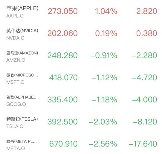 明星科技股跌多涨少,Meta跌2.56%,终结了连续九个交易日上涨的势头,这是该公司自去年10月以来最长的连涨纪录。苹果涨1.04%,英伟达涨0.19%,亚马逊跌0.91%,微软、谷歌和特斯拉跌超1%。