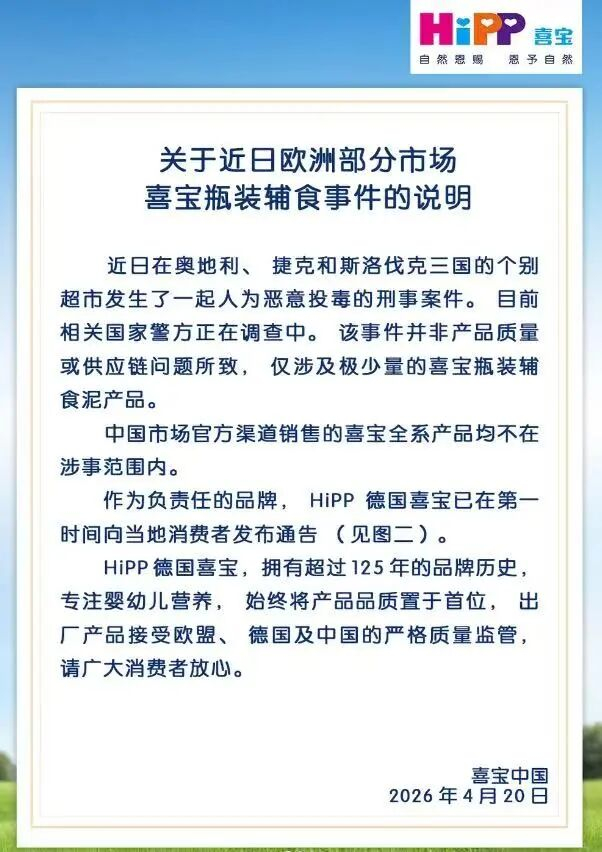 对此,喜宝中国发布针对该事件的情况声明称,该事件为奥地利,捷克等当地个别超市内发生的人为恶意投毒,属刑事案件,目前警方正在调查,非产品质量问题,且仅限于极少量的瓶装辅食泥。中国市场正规渠道销售的喜宝全系产品均不在涉事范围,安全可放心食用。