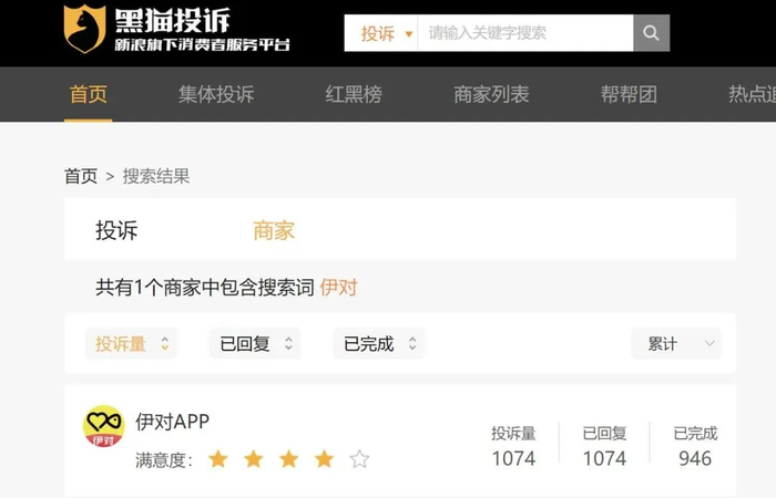 在黑猫投诉及消费保平台上,伊对相亲APP的投诉已经累计超过一千条。“诱导消费”“刷了礼物就失联”“批量扣费”......每隔一段时间,就有新的人进去投诉。