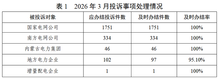 2026年3月,国家能源局派出机构受理职责范围内申诉事项137件,办结申诉295件(含往期结转),申诉事项主要集中在用电报装、电表计量、线路安全等方面。