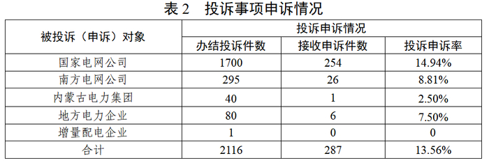 20263,办结投诉事项2116件(含上月结转)热线平台接收申诉事项287件,投诉申诉率13.56%申诉内容看,主要集中在用电报装、线路安全、电表计量等方面(详见图2)。其中,涉及国家电网公司254件、南方电网公司26件、内蒙古电力集团1件、地方电力企业6件(详见表2)。