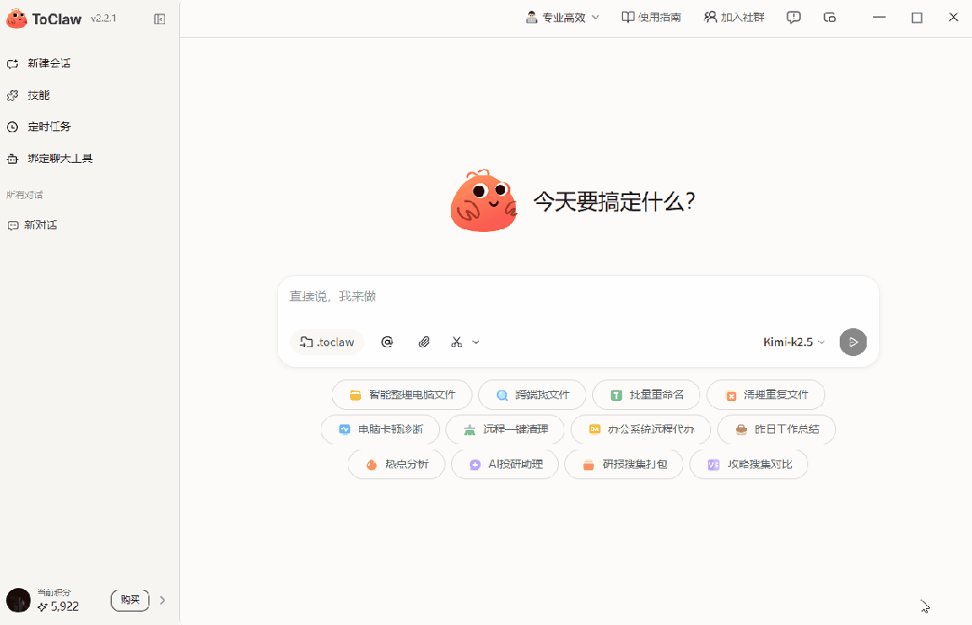 ToClaw目前还在公测阶段,新用户注册可获赠5000积分,每天登录还能额外领取1000积分。