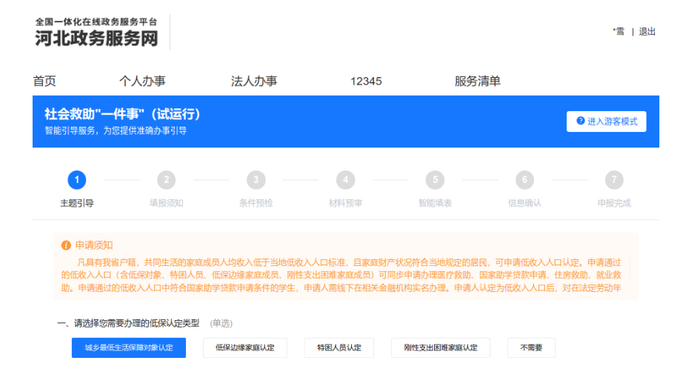 ①个人下载、登录“冀时办”App,点击“高效办成一件事”专区→在“个人办事”区域选择社会救助“一件事”。
