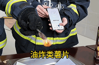 消防员选取油炸类和非油炸类这两种常见薯片,现场测试其易燃性。