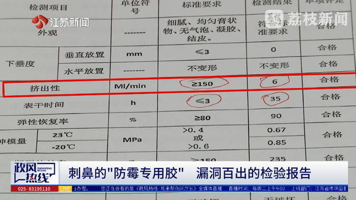 杭先生发现,该款“防霉专用胶”的检验报告漏洞百出!比如:产品的“挤出性”,标准要求是大于或等于150,检测结果是6,评定结果竟然是合格!产品的“表干时间”,标准要求是小于或等于3,检测结果是35,评定结果也是合格。
