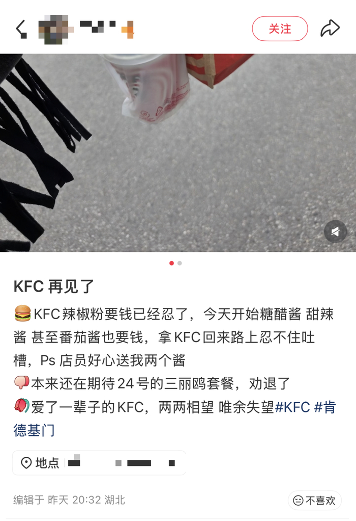 近日,不少网友在社交媒体发文称,在肯德基多要蘸酱需要额外付费,有的网友表示其所在的区域多要番茄酱也需要付费。