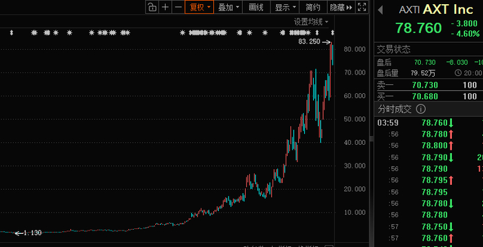 值得注意的是,磷化铟相关概念股股价大幅上涨,美股磷化铟龙头AXT从2025年4月下旬以来,股价累计涨幅超过60倍。美股光芯片龙头Lumentum从2025年4月下旬以来涨幅也超过16倍,其在3月宣布将新建一座6英寸磷化铟光学器件晶圆厂。