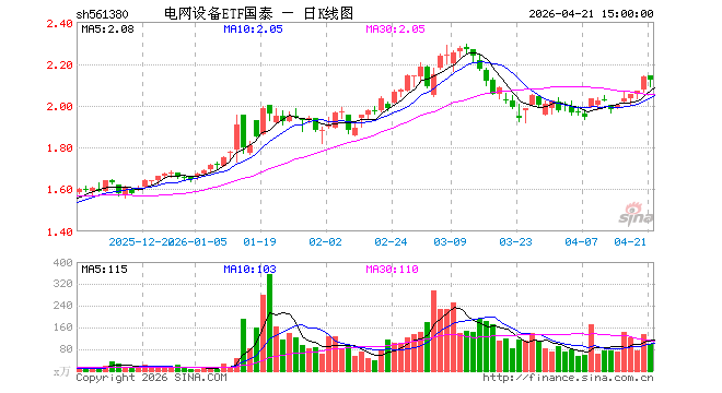 4月21日,电网设备ETF国泰(561380)跌0.80%,成交额2.12亿元。当日份额增加1.10亿份,最新份额为32.21亿份,近20个交易日份额增加3.66亿份。最新资产净值计算值为68.36亿元。