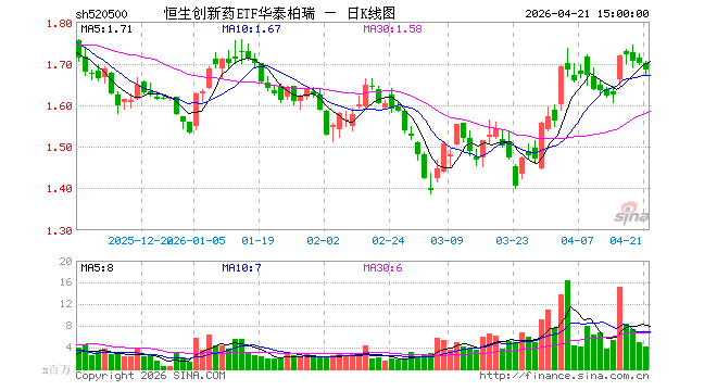 4月21日,恒生创新药ETF华泰柏瑞(520500)跌0.94%,成交额6.85亿元。当日份额增加100.00万份,最新份额为14.47亿份,近20个交易日份额增加5050.00万份。最新资产净值计算值为24.45亿元。