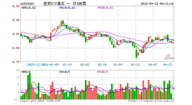 医药ETF嘉实(515960)开盘涨0.00%,重仓股药明康德跌0.36%,恒瑞医药跌0.27%