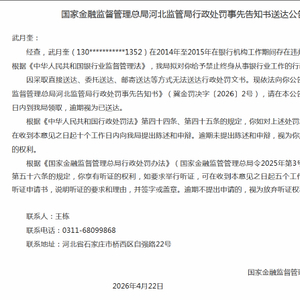 4月22日金融一线消息,据国家金融监督管理总局河北监管局行政处罚信息显示,武月奎在2014年至2015年在银行机构工作期间存在违规发放贷款行为,被拟给予禁止终身从事银行业工作的行政处罚。因采取直接送达、委托送达、邮寄送达等方式无法送达行政处罚文书,现依法向其公告送达《国家金融监督管理总局河北监管局行政处罚事先告知书》,并告知其享有陈述、申辩和听证的权利。