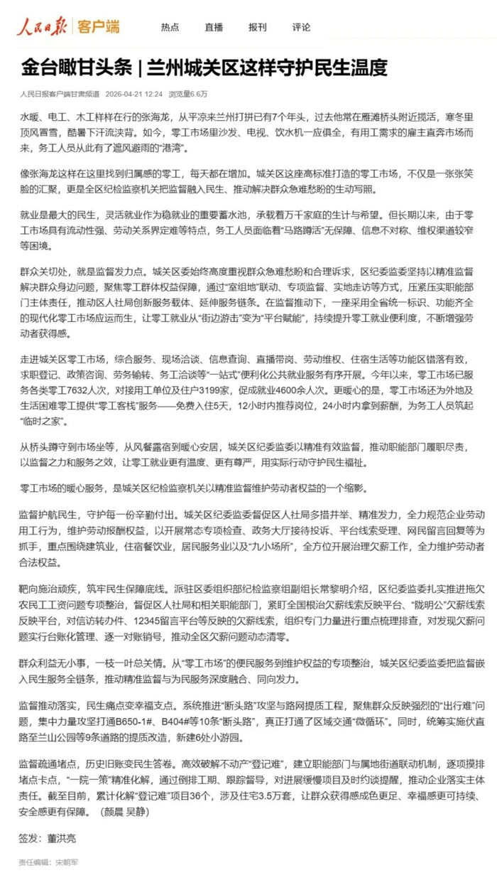 群众利益无小事,一枝一叶总关情。从“零工市场”的便民服务到维护权益的专项整治,城关区纪委监委把监督嵌入民生服务全链条,推动精准监督与为民服务深度融合、同向发力。