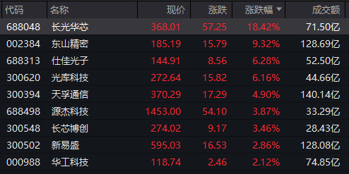 长光华芯大涨逾18%,盘中一度20%涨停,创出历史新高。东山精密大涨逾9%,盘中亦创出历史新高。仕佳光子、光库科技亦均大涨,盘中股价均刷新历史纪录。