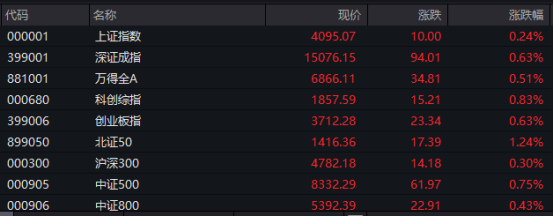 A股市场今天上午整体小幅上涨,截至上午收盘,上证指数涨0.24%,深证成指涨0.63%,创业板指涨0.63%,科创综指涨0.83%。