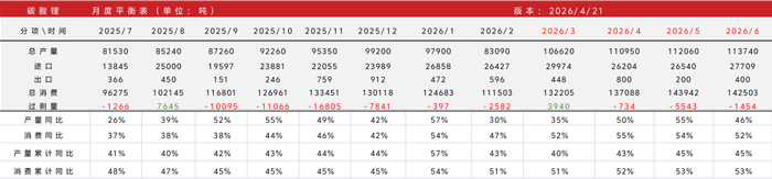 月度产量方面,2026年4月产量环比预计+4330吨至110950吨,环比+4.1%,其中辉石产、云母产、盐湖产、回收产碳酸锂分别+1050、+520、+1400、+1360吨至65100、14800、18690、12360吨(SMM)。3月产量达106620吨,环比+28%,符合月初预期。