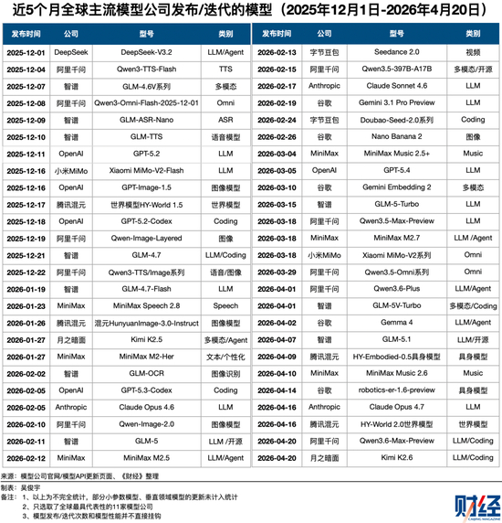 据《财经》不完全统计,2025年12月1日-2026年4月20日,美国市场(OpenAI、Anthropic、谷歌Gemini)和中国(包括阿里千问、字节跳动豆包、腾讯混元、小米MiMo、DeepSeek、月之暗面、智谱、MiniMax)的11家主流模型公司,至少发布或迭代了50款模型,几乎每2.8天就会有一款模型发布或迭代。