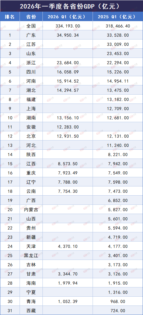 15个省市2026年一季度GDP出炉!广东排第一,重庆超辽宁