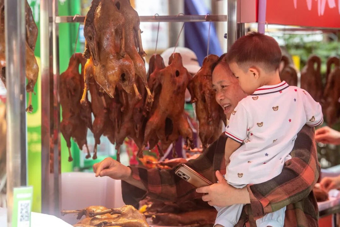 重庆市荣昌区的夏布小镇景区,游客在选购荣昌卤鹅/ 新华社记者 唐奕 摄
