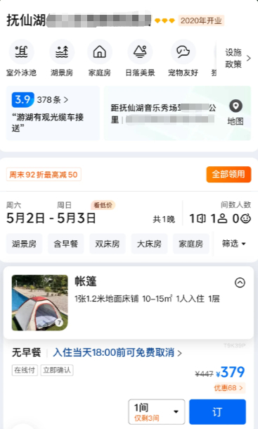 有网友计算,一套普通露营帐篷售价仅几百元,酒店推出的单人帐篷每晚381元,性价比过低。
