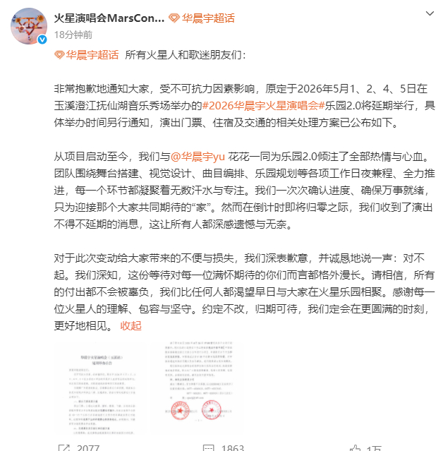 4月22日晚,歌手华晨宇发文致歉,在云南举办的火星乐园2.0因不可抗力延期。