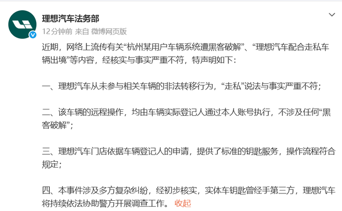 4月22日,@理想汽车法务部 发声明:近期,网络上流传有关“杭州某用户车辆系统遭黑客破解”、“理想汽车配合走私车辆出境”等内容,经核实与事实严重不符,特声明如下: