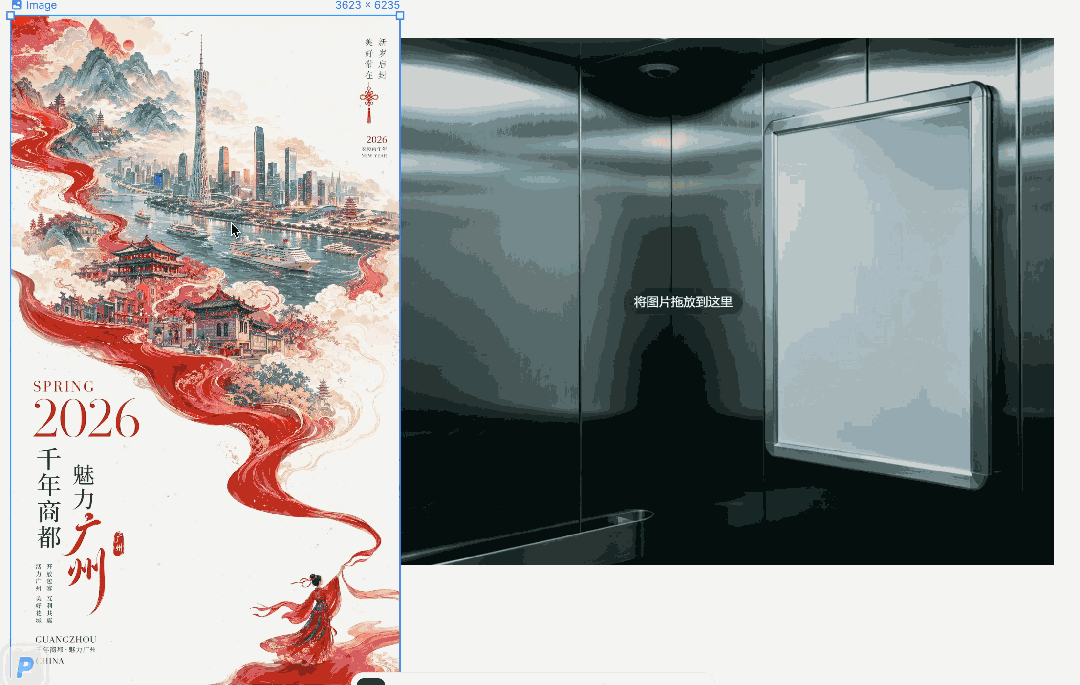 然后把刚才那张广州的海报拖进去,一键合成。