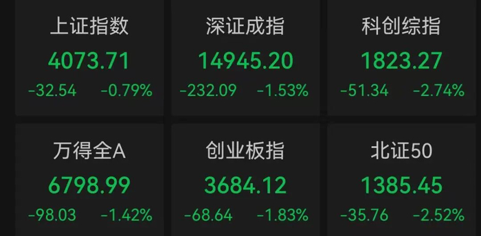 上午收盘,上证指数下跌0.79%,深证成指下跌1.53%,创业板指下跌1.83%,科创综指下跌2.74%。