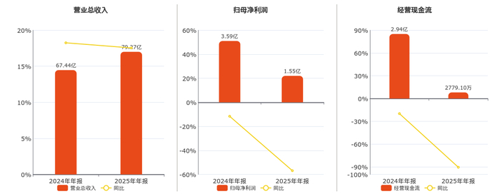 公司营业总收入为79.27亿元。归母净利润为1.55亿元,较去年同报告期归母净利润减少2.04亿元,同比较去年同期下降56.88%。经营活动现金净流入为2779.10万元,在已披露的同业公司中排名第134,较去年同报告期经营活动现金净流入减少2.66亿元,同比较去年同期下降90.55%。