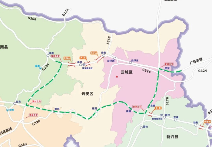 路线2:沿G80广昆高速连滩出口→234国道→S368线省道→G80广昆高速云浮西收费站→重新进入G80广昆高速