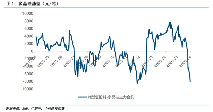 26Q1期间多晶硅期货价格连续走跌,季度内跌幅约37%,其中3月份单月跌幅达21.56%。我们在4月中旬基于企业生产动态及现金成本对比,判断多晶硅价格已见底、不宜继续看空(【建投硅能源】多晶硅周报|价格底或将显现20260413)。然而,近期多晶硅期货价格的反弹力度明显超出我们预期,原因在于期货价格已大幅偏离现货价格,基差在短期内由现货升水快速转为贴水。在此情形下,期货与现货价格均未出现进一步修复基差的趋势。