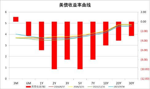 上周,国内发布3月社融、进出口及一季度经济数据,其中代表内需的社融及社零表现不佳,人民币贷款同比由6.1%下滑至5.8%,社零由2.8%下滑至1.7%均表明国内经济内生动力仍有待回升。往后看,扩大内需仍是政策发力方向,同时产业链优势带来的出口稳定性对经济增速能够形成一定支撑,海外不确定性较大背景下经济基本面预计将出现一定的震荡回升。海外方面,中东局势延续此前的降温,但周末伊朗方面重新封锁海峡使得后续地缘局势仍面临较大不确定性。降息预期方面,随着油价回落,市场对货币宽松的预期有所增加,目前市场预期4月FOMC加息的概率由2.07%回落至1.03%。