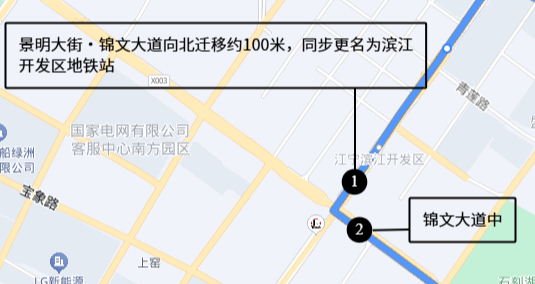 ·原“景明大街·锦文大道”站点向北迁移约100米,同步更名为 “滨江开发区地铁站” (涉及线路873路、892路),并新增“锦文大道中”站点,助力无缝换乘。