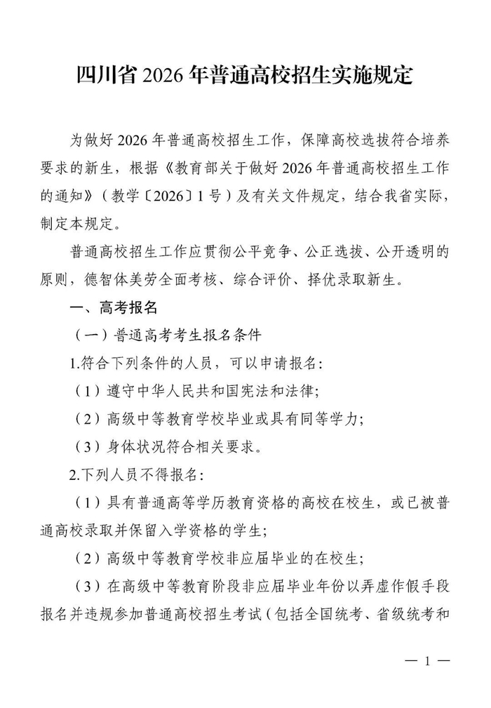 四川省2026年普通高校招生实施规定发布,全文如下。
