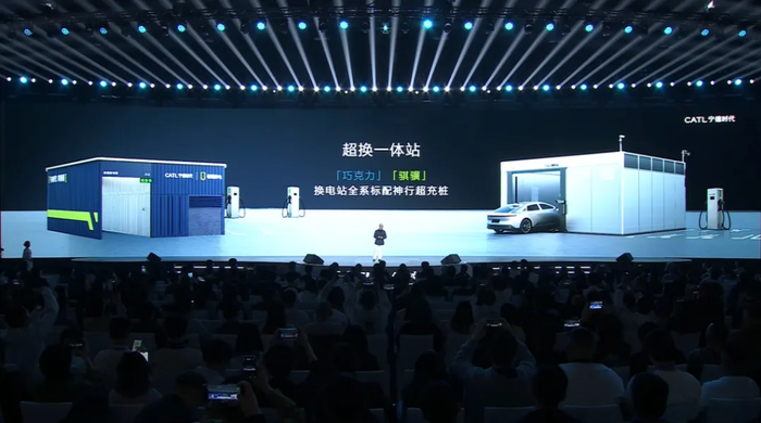 除了这五款电池,宁德时代还带来了超换一体站。以后乘用车的巧克力换电站和重卡的骐骥换电站都将配备神行超充桩,利用站内电池作为储能,不需要额外配备储能柜,就可以做到超过电网容量的超充功率输出,同时满足换电和超充需求。
