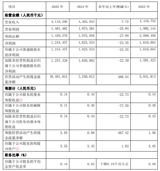 4月23日金融一线消息,紫金银行发布2025年年度报告。截至 2025 年末,全行总资产 2903.43 亿元,较年初增加 203.99 亿元,增幅7.56%;各项存款余额 2245.00 亿元,较年初增加 145.35 亿元,增幅 6.92%;各项贷款余额1949.07 亿元,较年初增加 60.56 亿元,增幅 3.21%;营业收入 41.18 亿元,同比下降7.72%;净利润 12.44 亿元,同比下降23.35%;不良贷款率1.35%,较上年末增加 0.11 个百分点;拨备覆盖率 180.09%;净息差1.13%,较上年减少0.29个百分点。