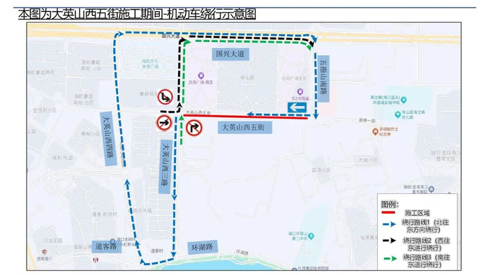 记者从海口市公安局交通管理支队获悉获悉,因琼山区红城湖片区隐患排水管道维修及升级改造项目施工需要,计划于2026年04月30日-6月30日进行管道开挖施工,需占用大英山西五街(大英山西三路至五指山南路段)半幅部分空间,此路段机动车由双向通行调整为由东向西单行,途经此路段西往东方向车辆,可通过大英山西三路、国兴大道进行绕行。
