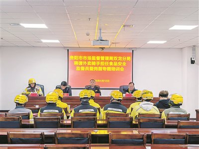 贵阳市市场监管局双龙分局工作人员对外卖骑手食品安全监督员进行岗前专题培训。