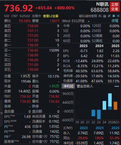 大河财立方消息,4月24日,A股开盘,新股N联讯(688808.SH)开盘大涨800%,每股报736.92元,最新市值757亿元。