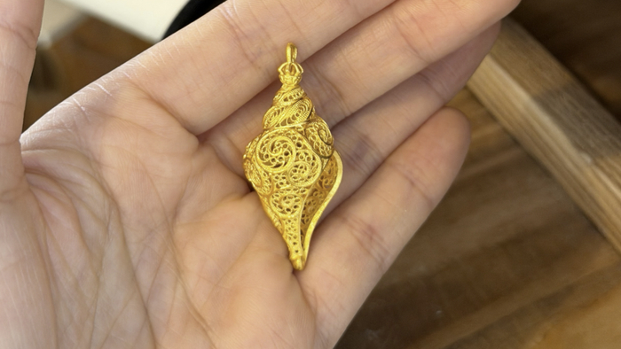 近一年,她熔掉了300克黄金,制成二十件各式吊坠,手上还剩700克,够她玩很久。她已经二三十分钟就能打出一款金首饰。前阵子,她刚开启橱窗,目前还没有什么销量。