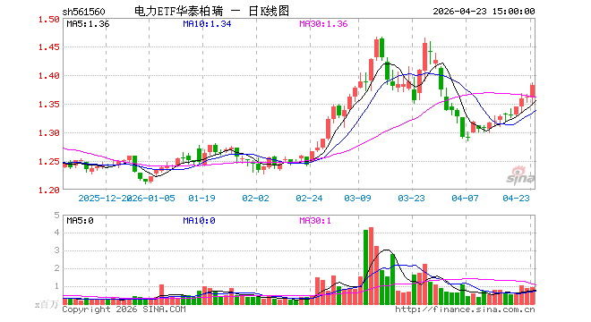 4月23日,电力ETF华泰柏瑞(561560)涨1.54%,成交额1.26亿元。当日份额增加1550.00万份,最新份额为22.56亿份,近20个交易日份额增加9500.00万份。最新资产净值计算值为31.18亿元。
