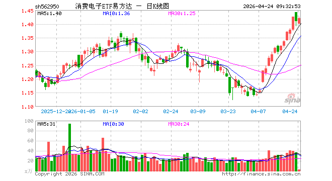 消费电子ETF易方达(562950)开盘跌0.71%,重仓股立讯精密跌0.38%,寒武纪跌0.25%