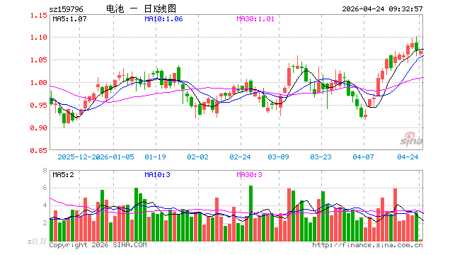 电池ETF汇添富(159796)开盘跌0.75%,重仓股宁德时代涨0.71%,阳光电源跌0.40%