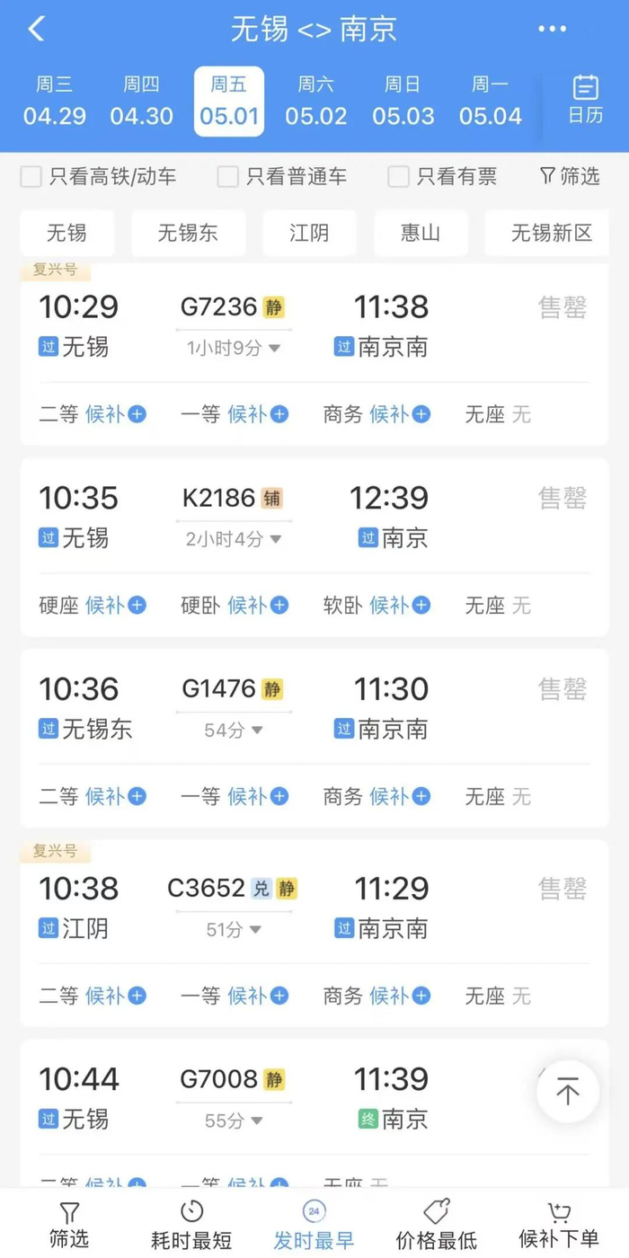 无锡出发,多趟车次已售罄