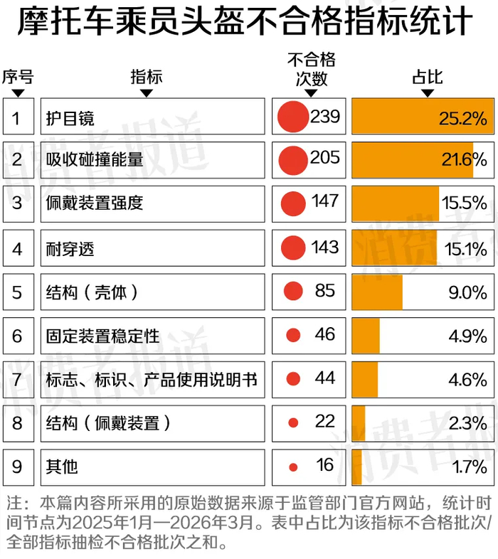 近日,《消费者报道》记者整理了国家市场监督管理总局及各省市级市场监督管理局近14个月(2025年1月—2026年3月)发布的摩托车乘员头盔抽检情况。