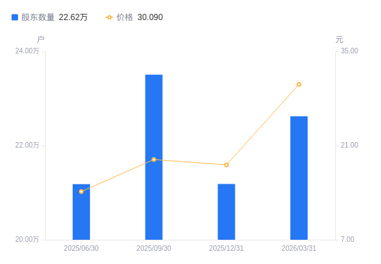 近一年(2025年3月31日至2026年3月31日),中天科技A股股东户数从25.26万户,减低至22.62万户,降幅10.45%,区间股价上涨110.39%。