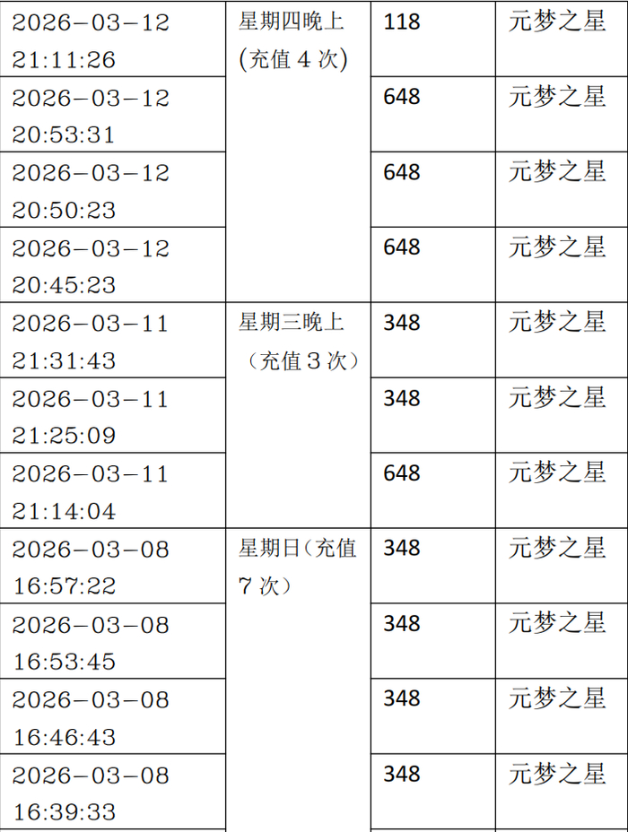 李先生提供的部分游戏充值记录显示,充值时间集中在工作日晚上和周末。