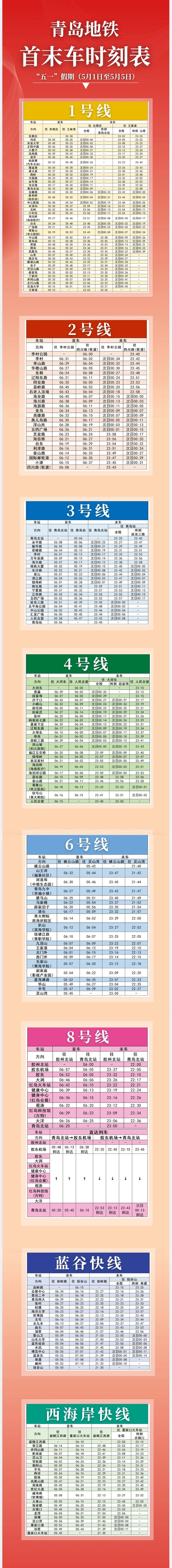 4月30日(假期前一工作日),1、2、3、4号线双向末车,6号线往横云山路、8号线往胶州北站、蓝谷快线往钱谷山、西海岸快线往董家口火车站方向末车均延后1小时;8号线夜间往青岛北站方向23:15、23:45各增开1列直达列车。当日线网各站早间首车时间保持不变。